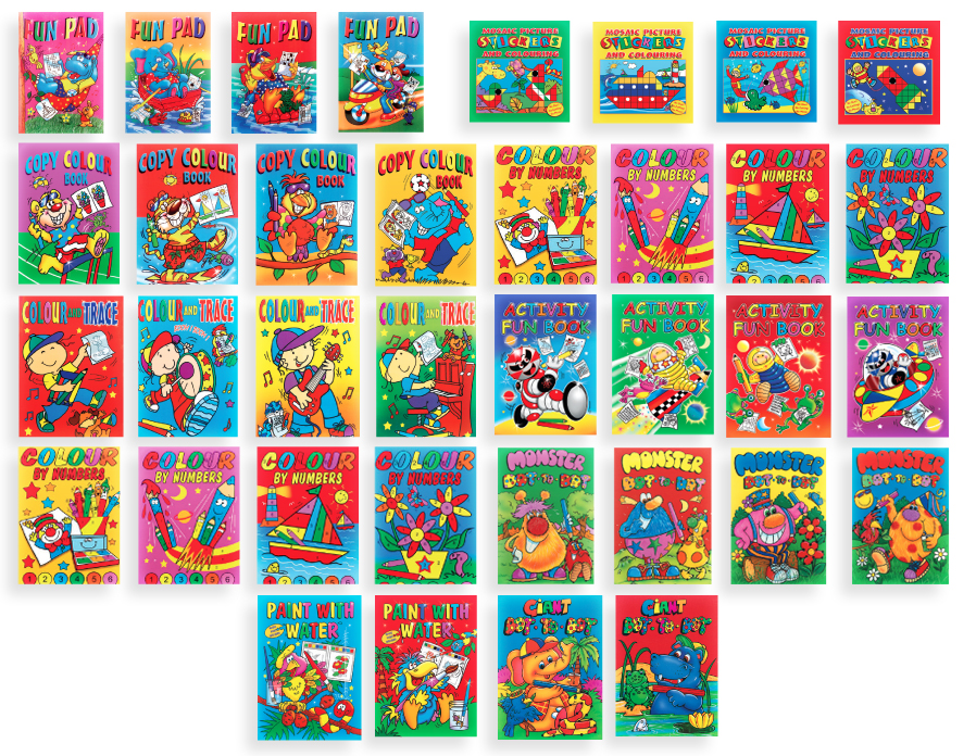 The Activity Book range has titles such as: Dot to Dot, Puzzle, Activity, Copy Colour, Colour and Trace, Colour by Numbers, Finish the Picture and Doodle.