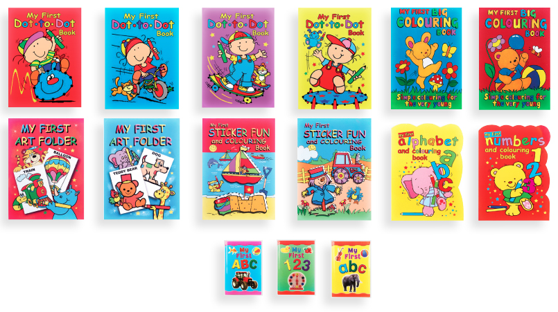 The My First... range of books has been specially developed with the very young artist in mind. The Colouring Books and Art Folders have simple illustrations with thick black lines to colour within, whilst the Dot to Dot Books have short number runs and, again, very easy pictures to create.My First Sticker Books have fewer but larger stickers to apply and simple drawings to colour in afterwards.