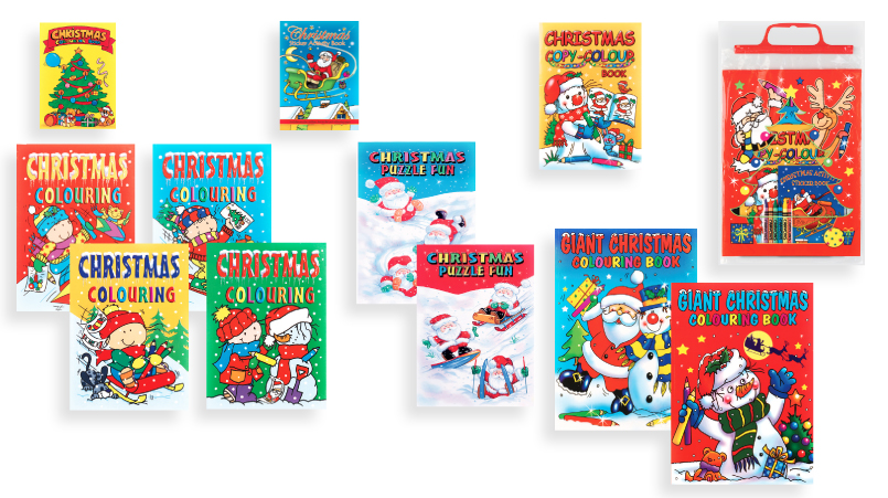 Christmas Books start at pocket money prices for mini Christmas stocking fillers whilst more expensive Christmas Activity Fun Packs and Christmas Colouring Books with white content paper are intended as gift items and Santa Grottos.